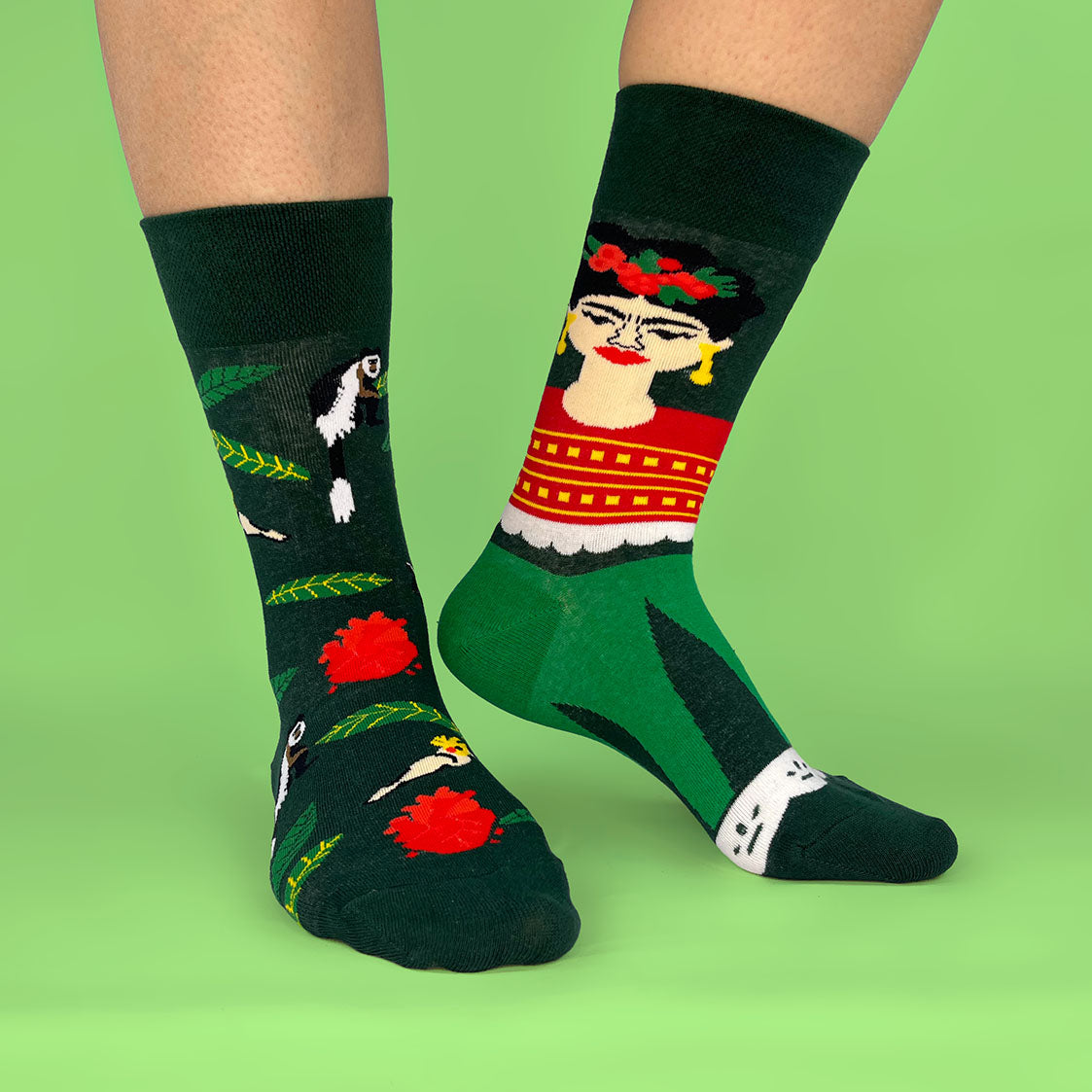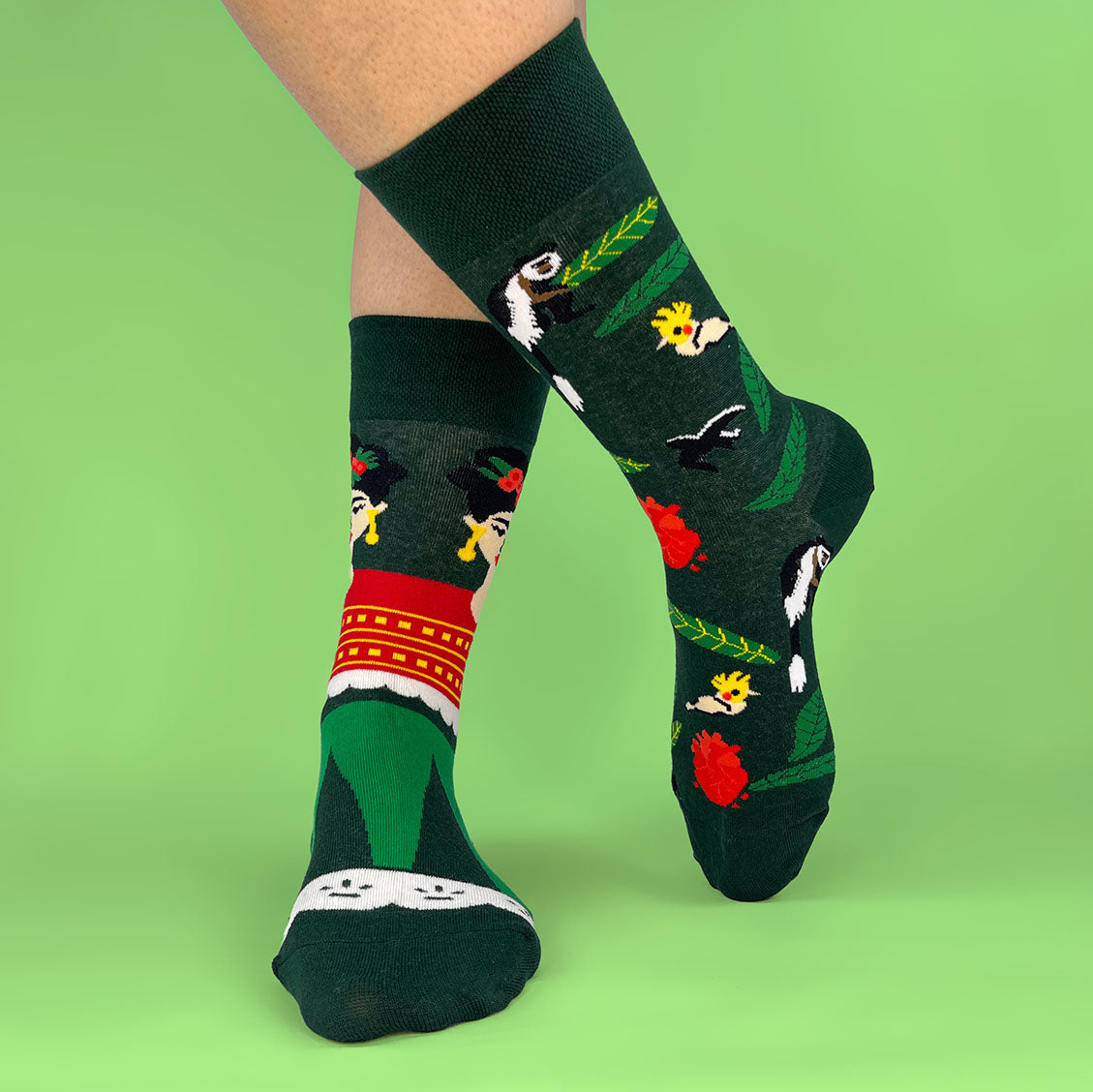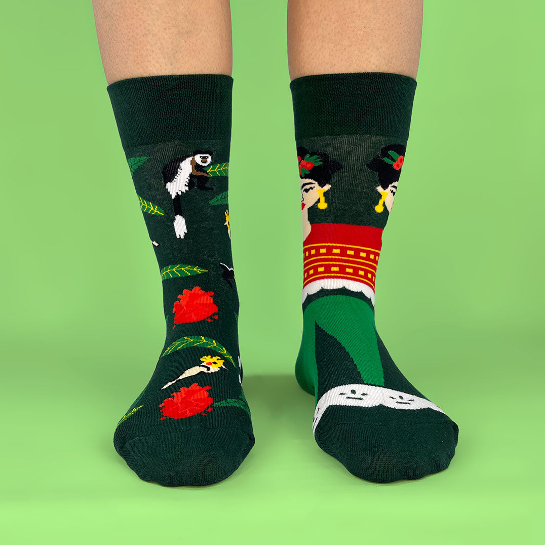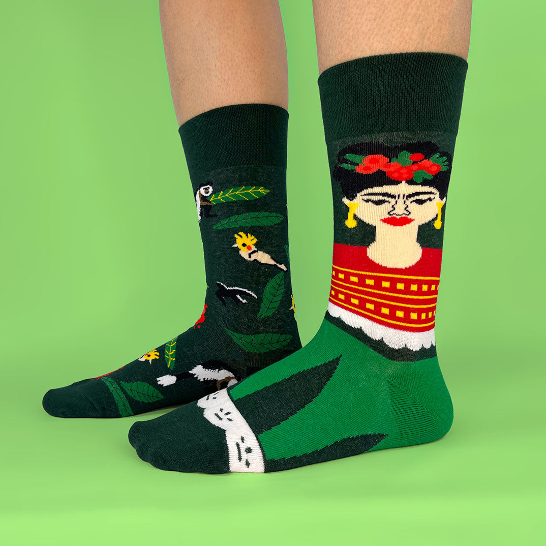 Un calcetín con la icónica imagen de Frida Kahlo y otro con un paraíso de aves y flores; cómodos, frescos y con un diseño que mezcla cultura, humor y estilo para caminar con personalidad.