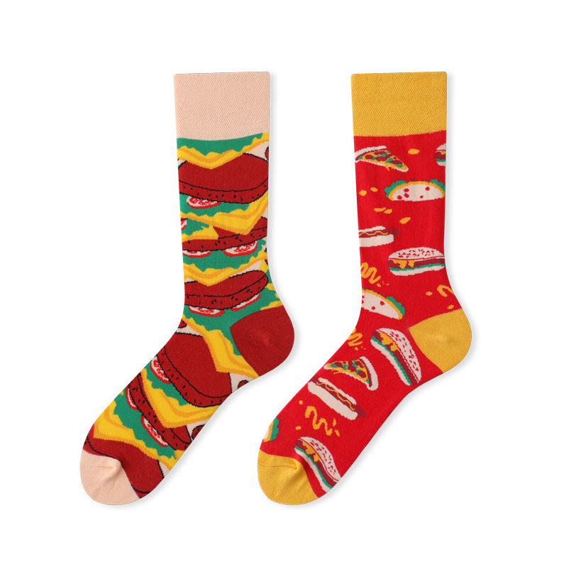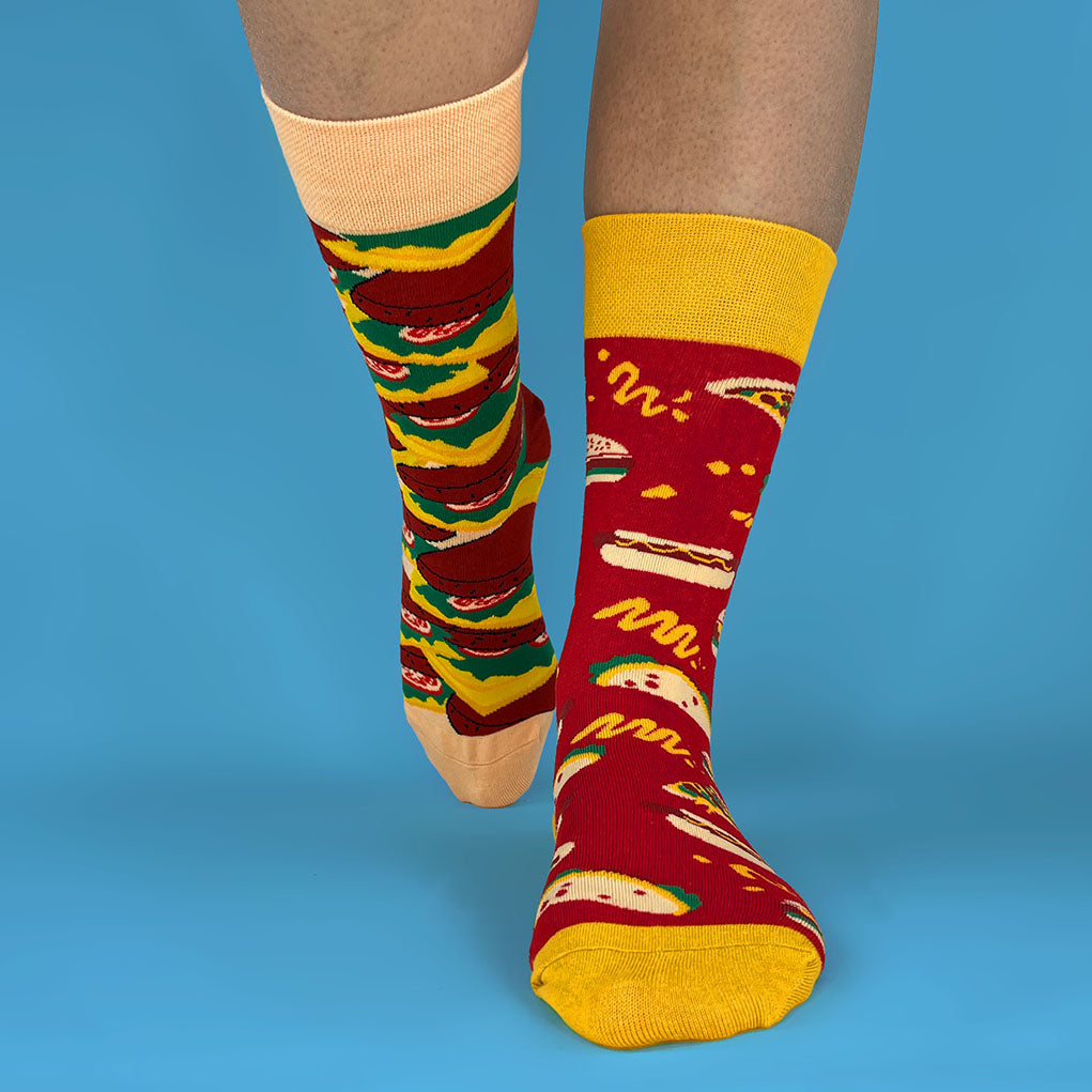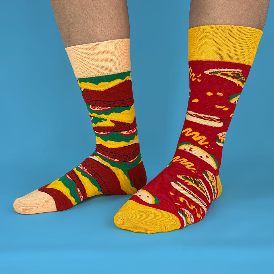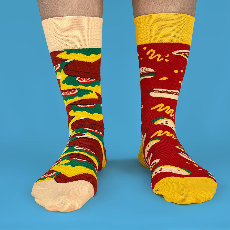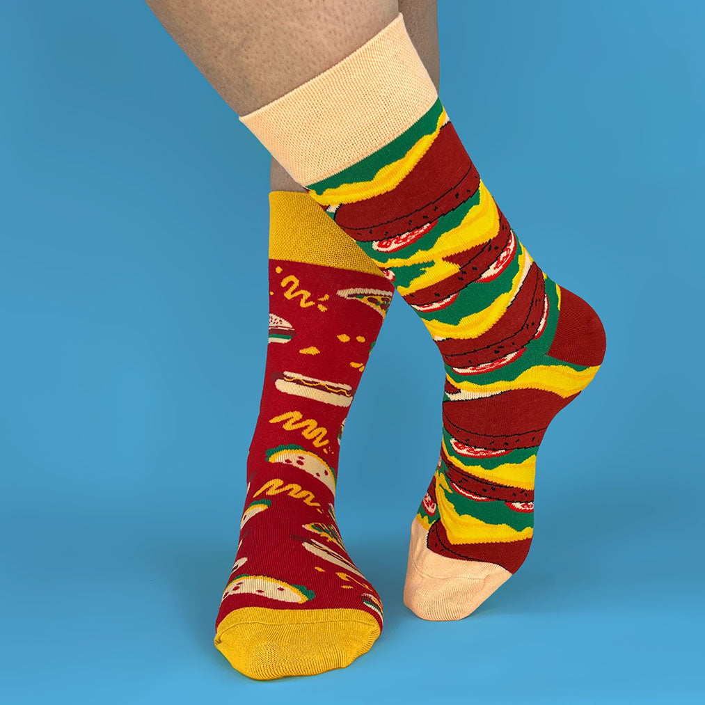 Tus pies también tienen hambre 🍔🌭. Un calcetín cargado de hamburguesas gigantes y otro con hot dogs y tacos listos para el antojo visual.