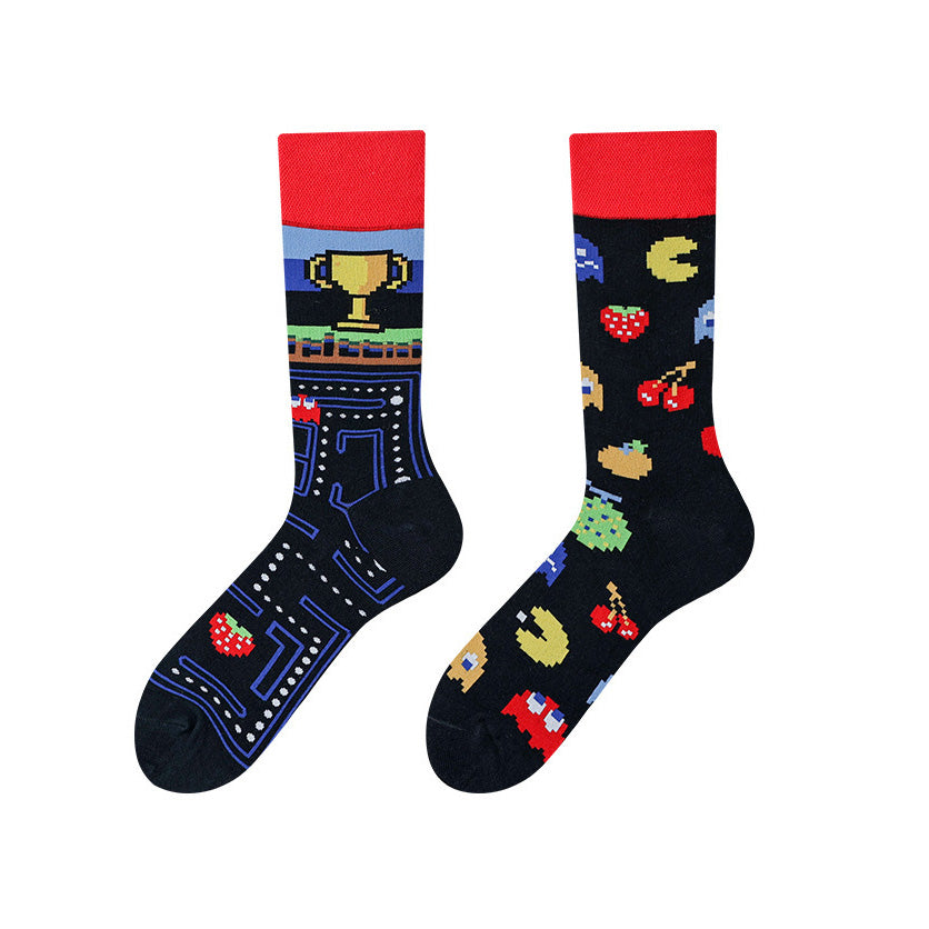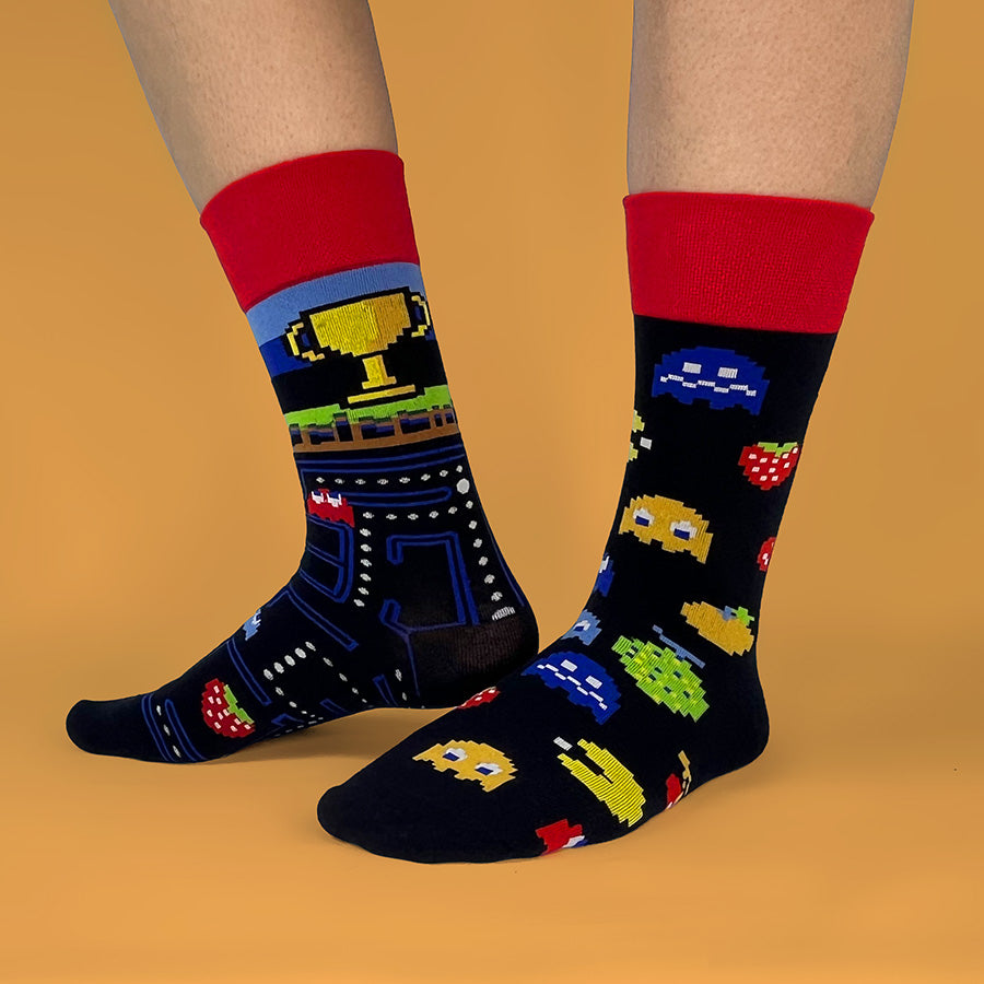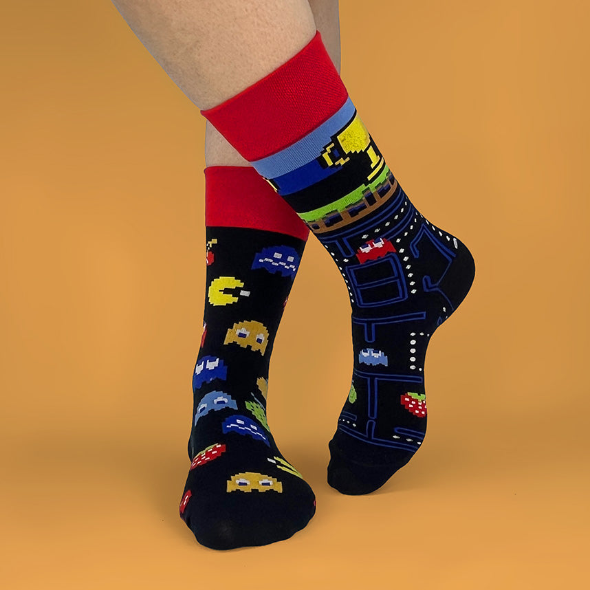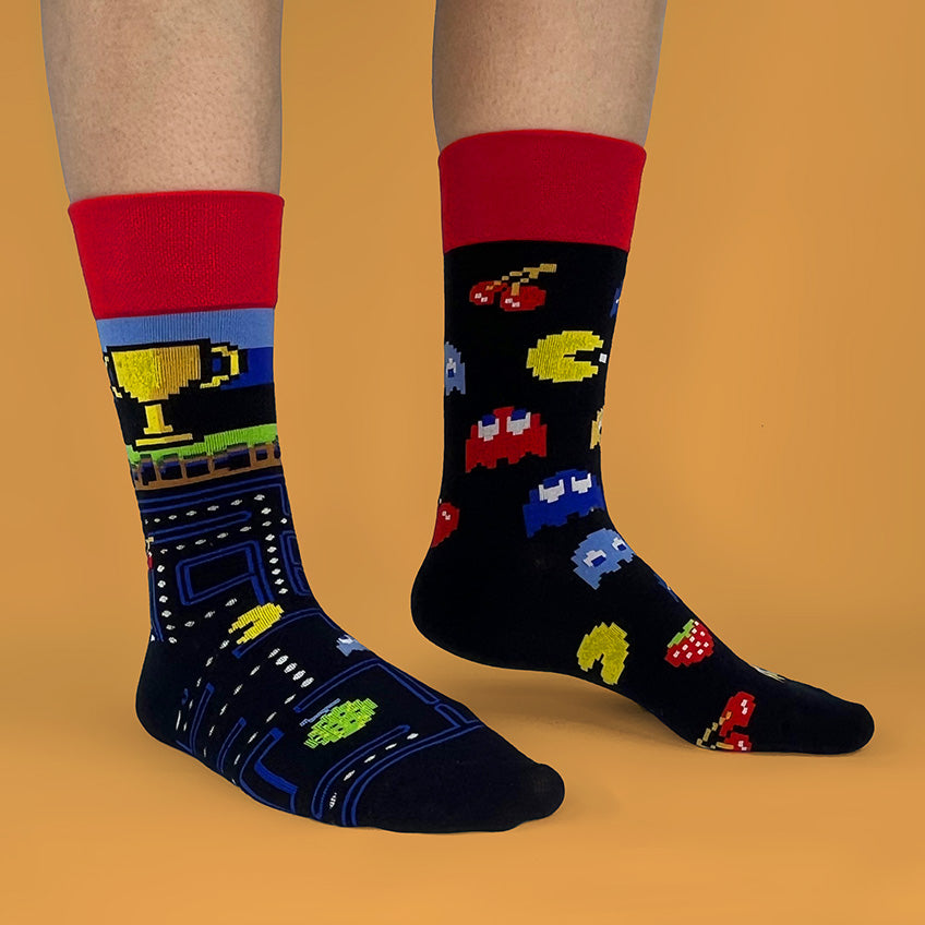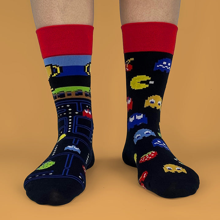 Un calcetín con el recorrido del laberinto y otro con personajes, frutas y fantasmas clásicos; cómodos, frescos y llenos de estilo retro para gamers, coleccionistas y nostálgicos que quieren llevar la diversión puesta.
