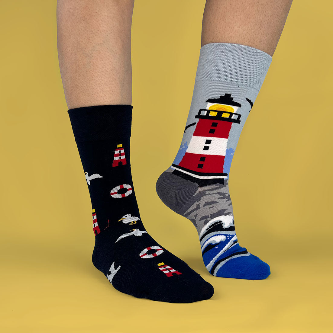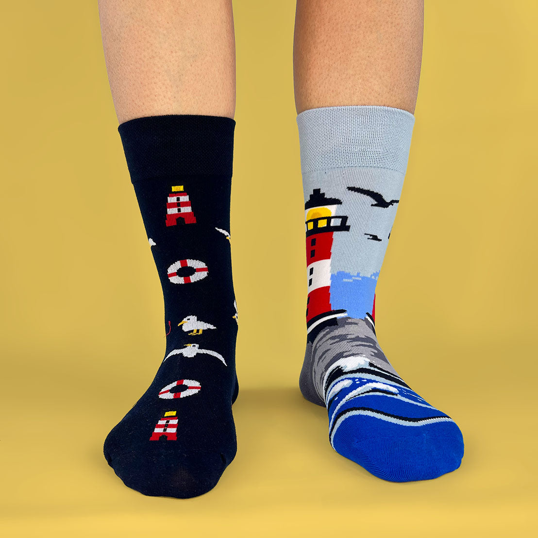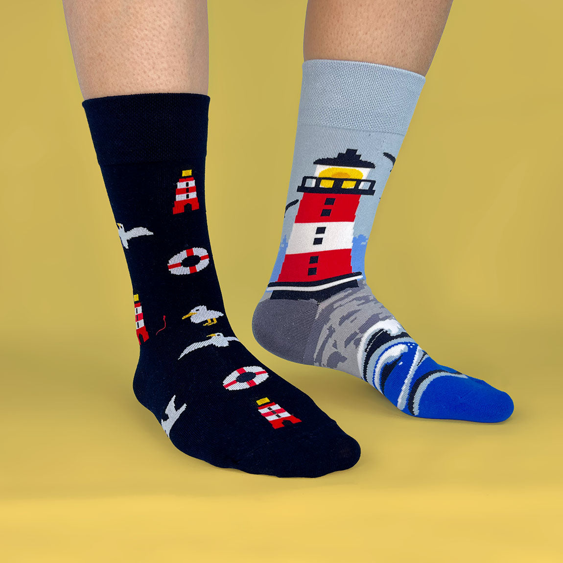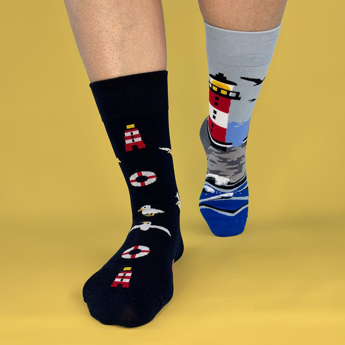 Cuando la vida se pone nublada 🌊, siempre hay un faro que guía. Un calcetín con el faro que ilumina hasta los días grises y otro con gaviotas en vuelo; cómodos, frescos y con un diseño que mezcla humor, estilo y personalidad.