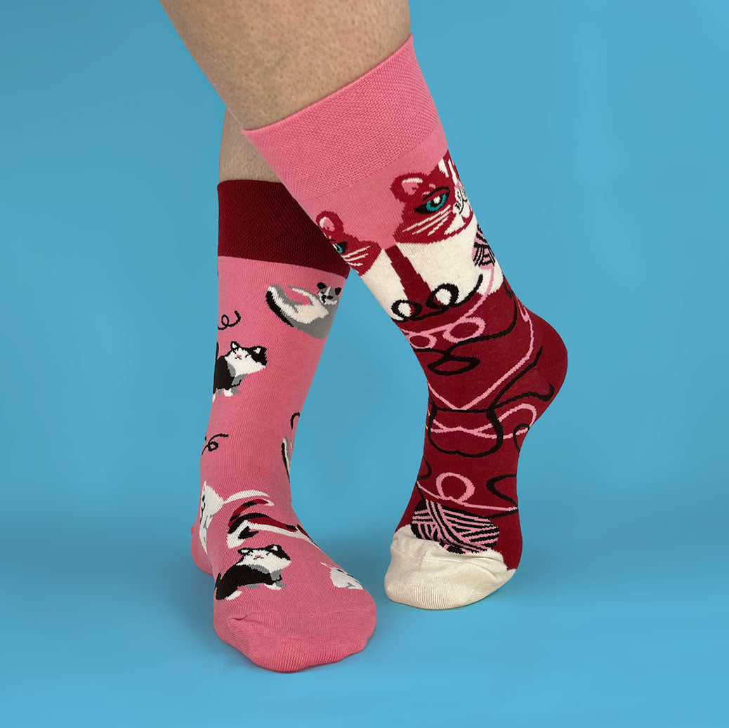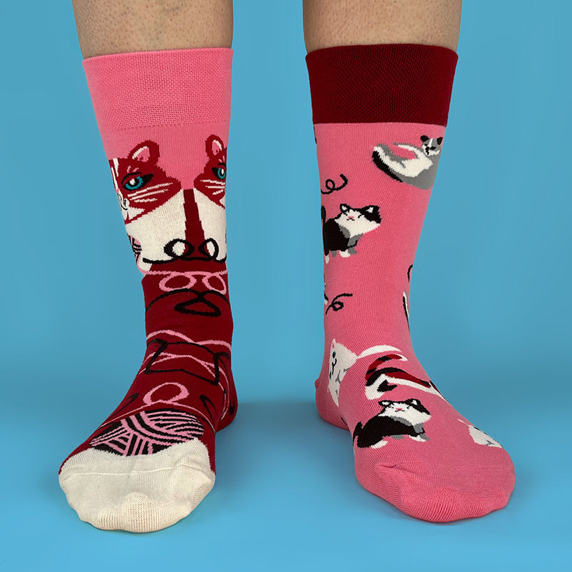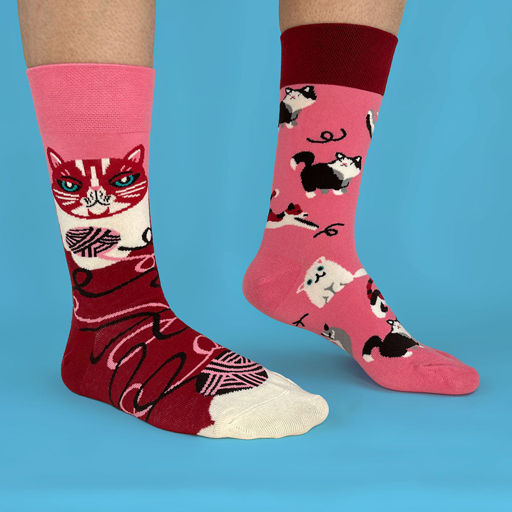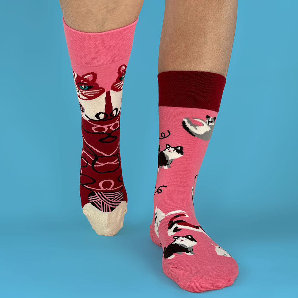 Porque todo amante de los gatos sabe que ellos siempre mandan 😼🐾. Un calcetín lleno de gatitos juguetones y otro con un gato protagonista de mirada mandona.