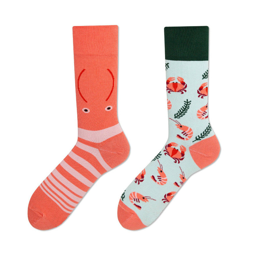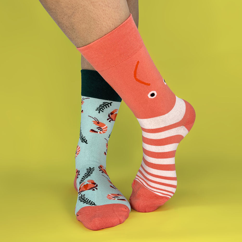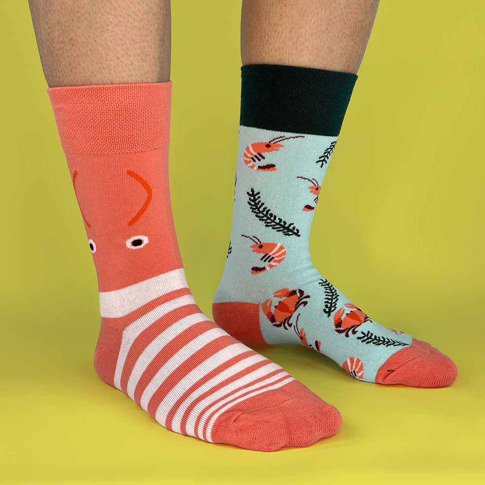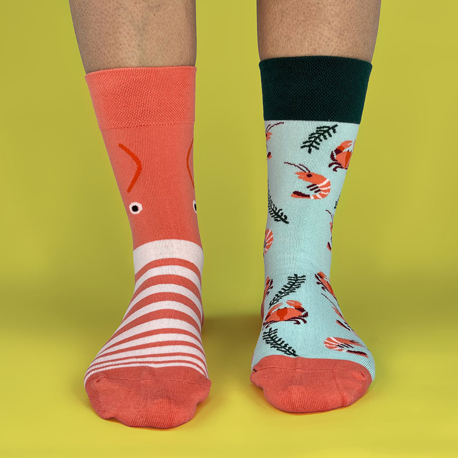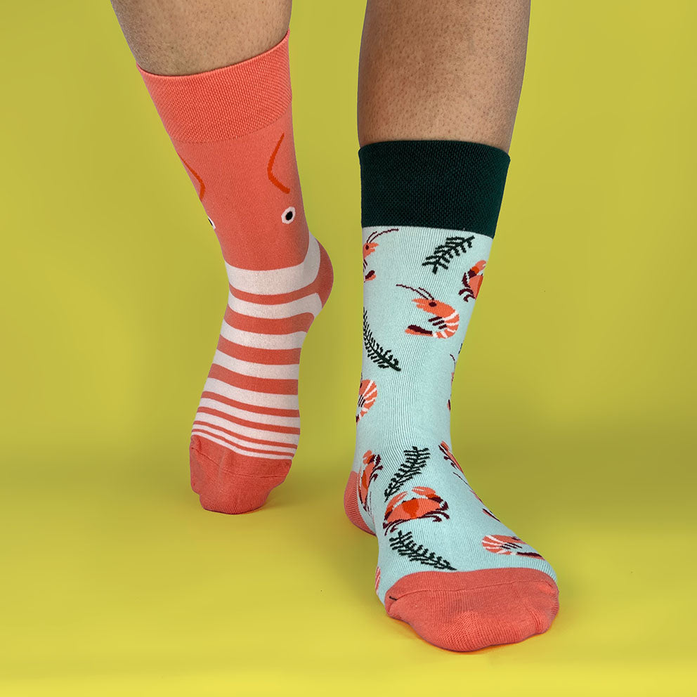 Del mar directo a tus pies 🦞🍤. Un calcetín con langosta lista para robarse miradas y otro con camarones en diseño fresco y divertido.