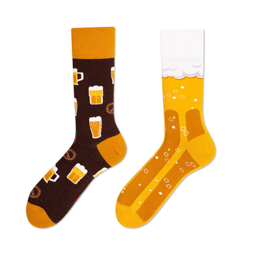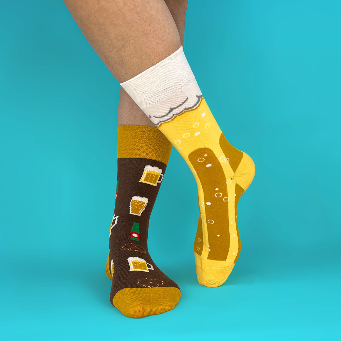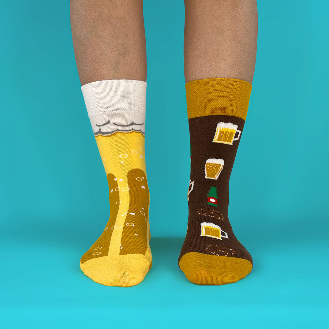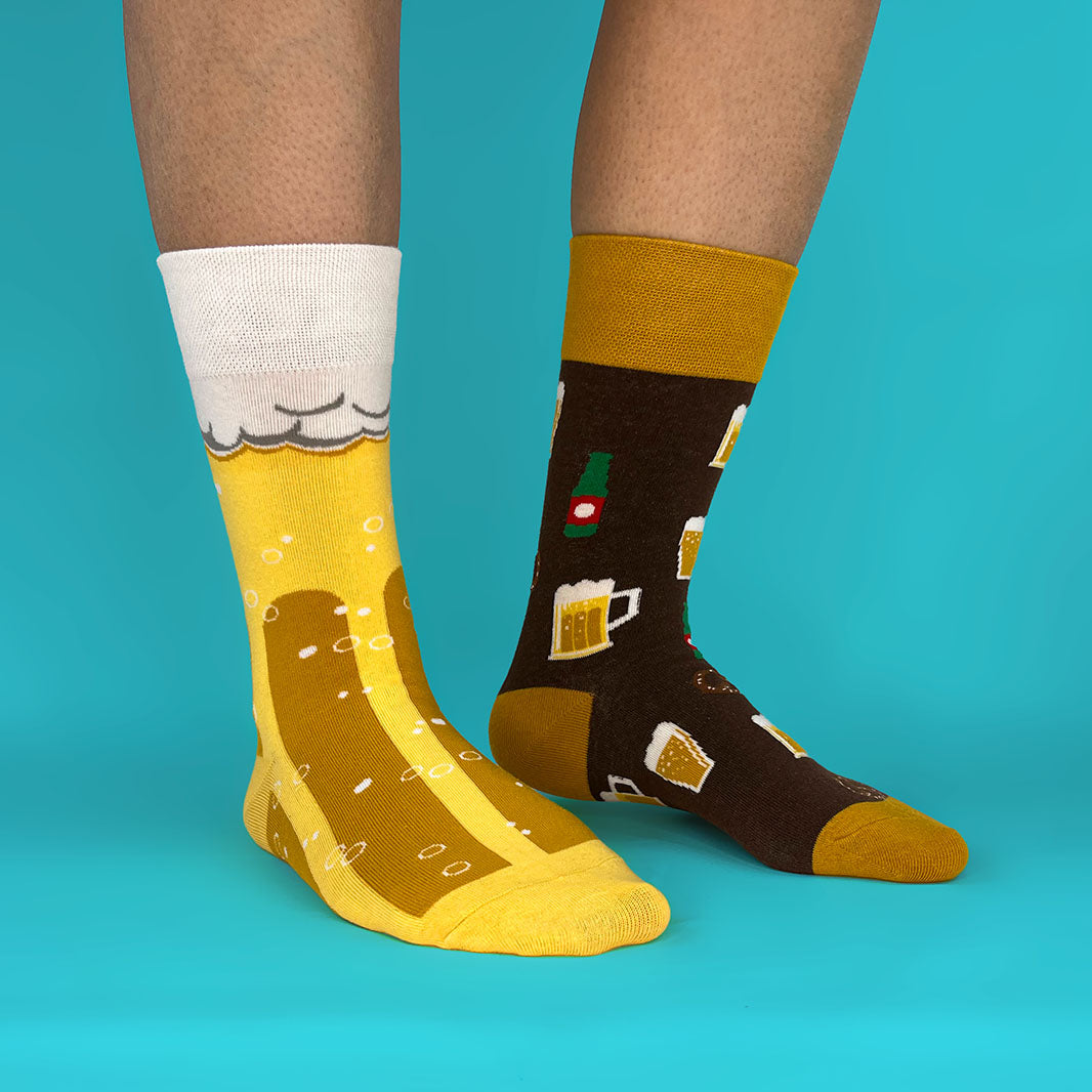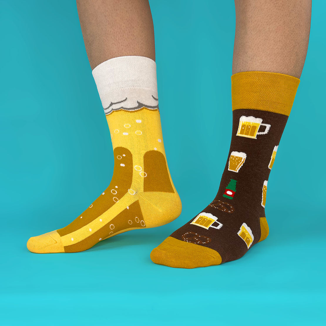 Un calcetín lleno de chops y vasos que invitan a celebrar y otro convertido en una pinta gigante; cómodos, frescos y con la dosis justa de humor para romper el hielo en cualquier lugar.