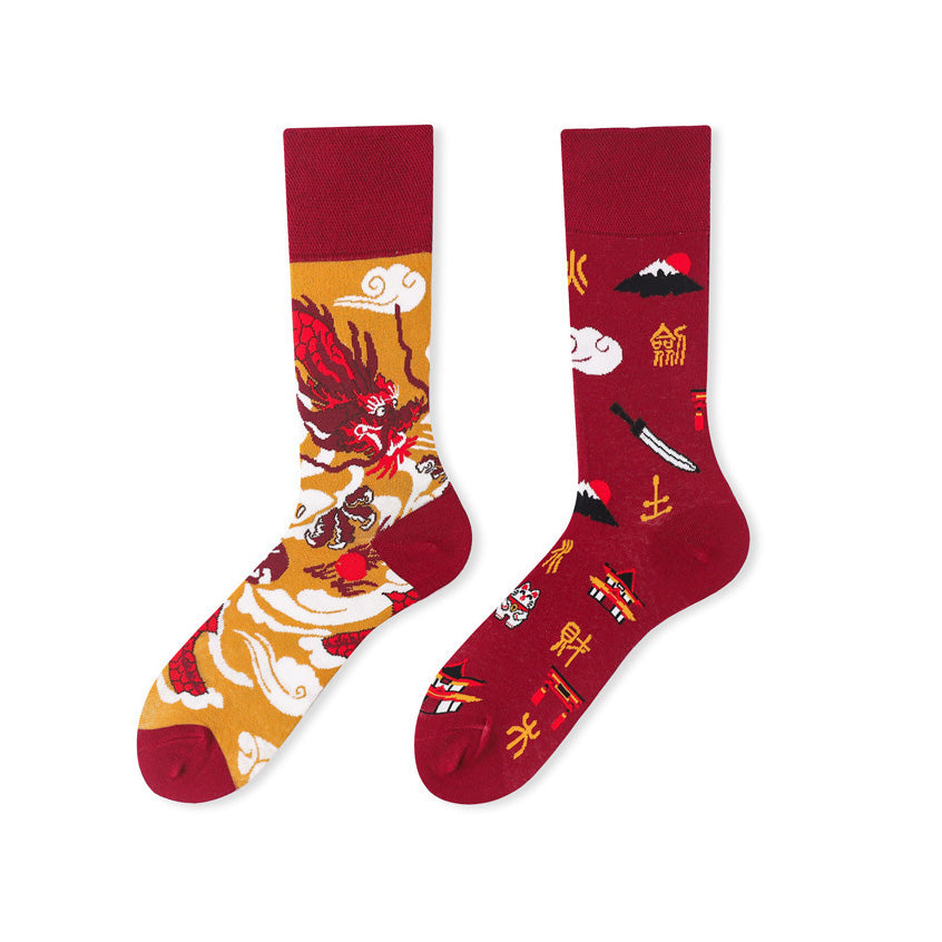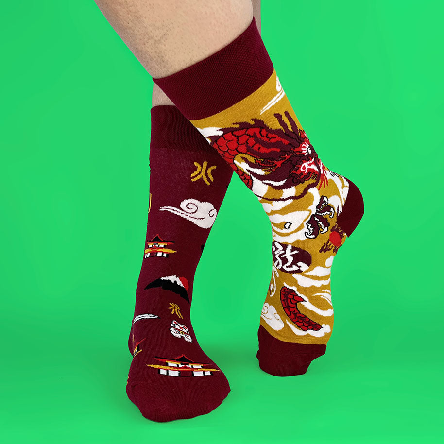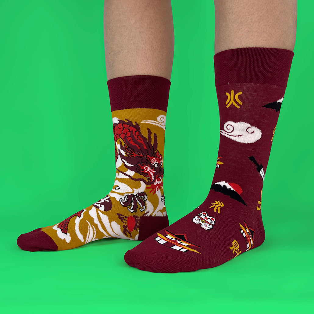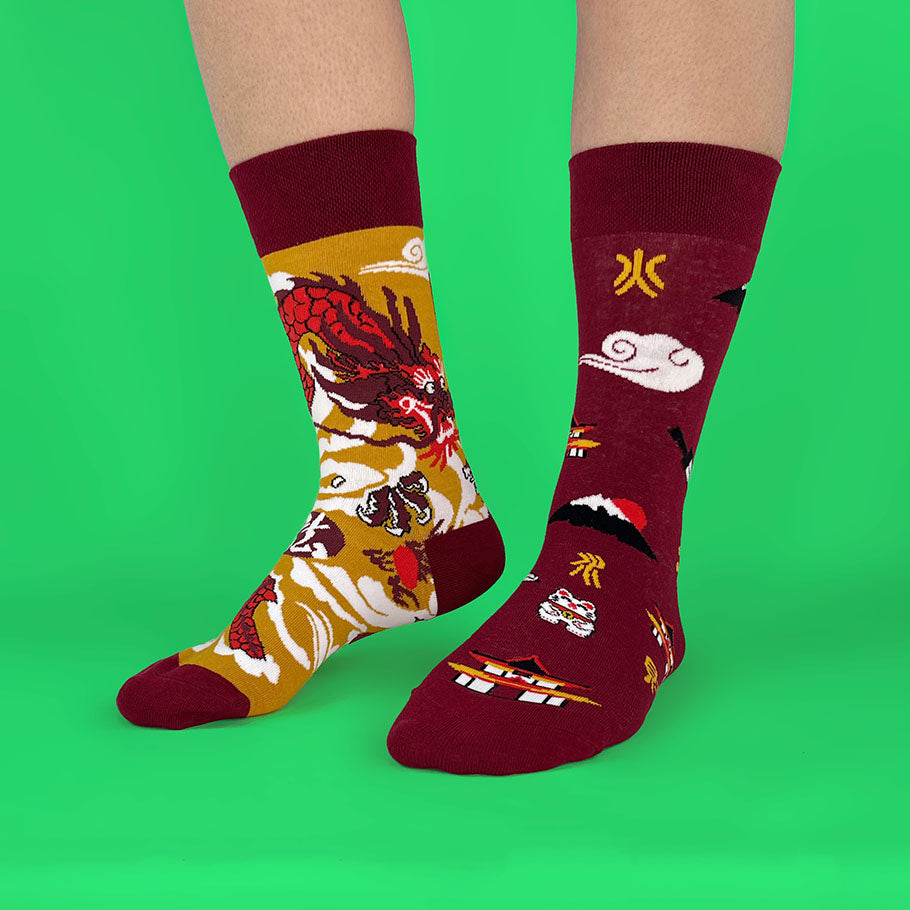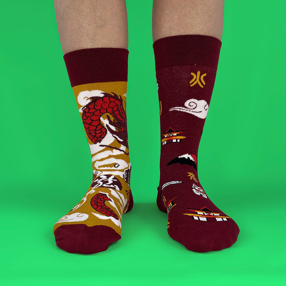 Un calcetín con un dragón imponente entre nubes y otro con símbolos orientales que transmiten fuerza y carácter; cómodos, frescos y con un look que mezcla respeto y buena onda.