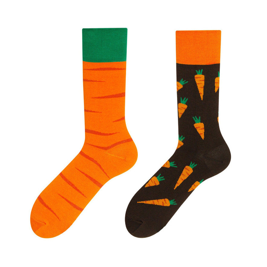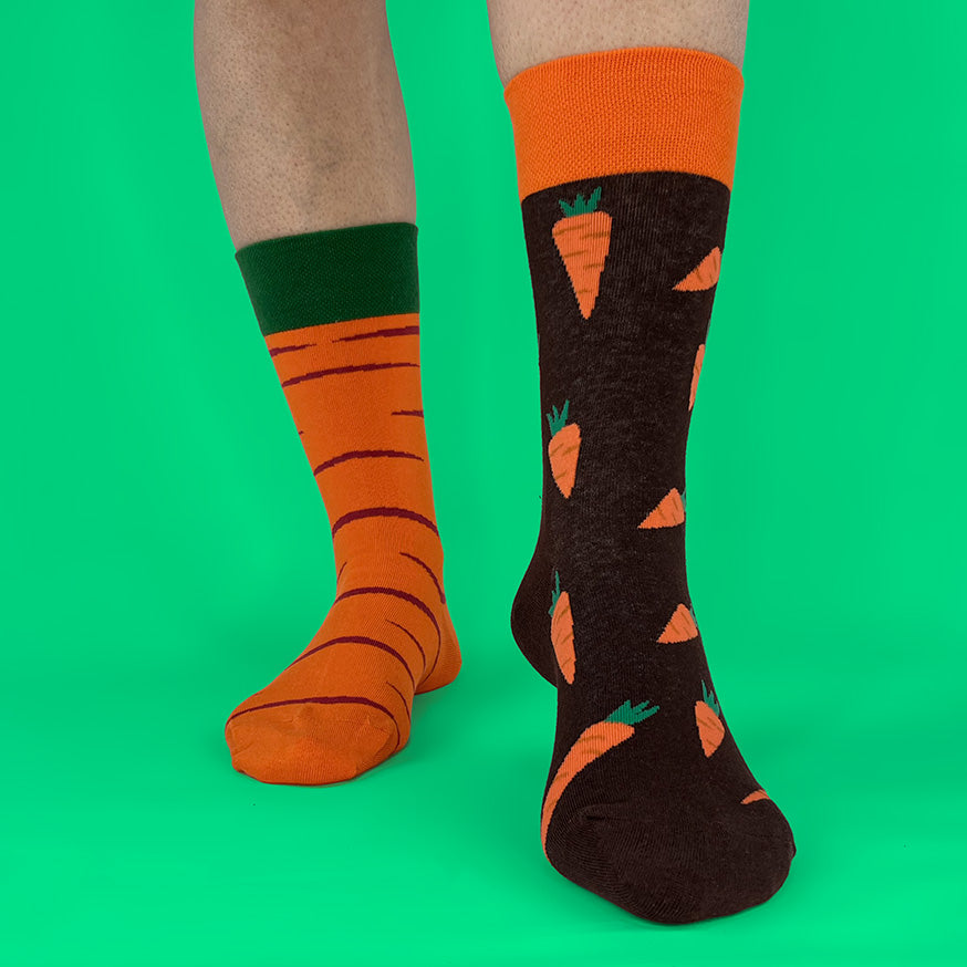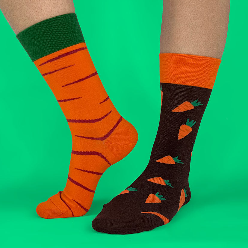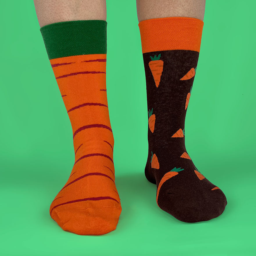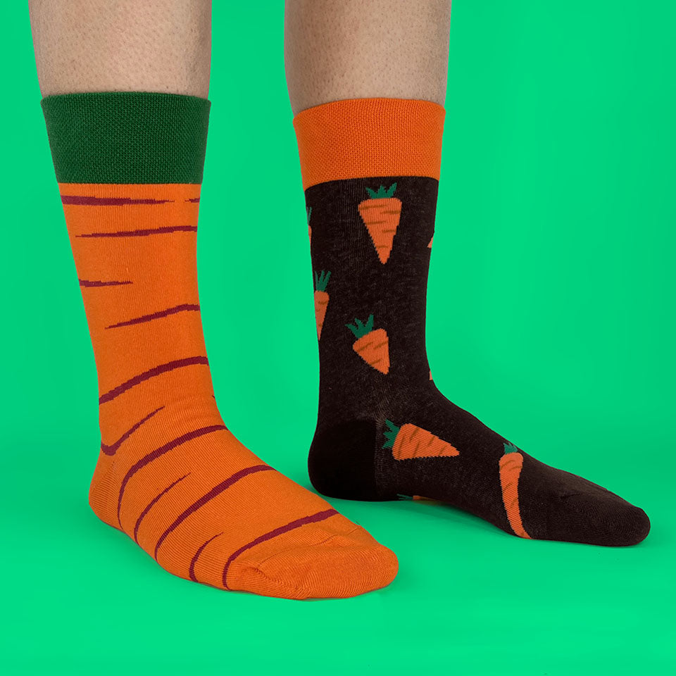 Tus pies también necesitan vitaminas 🥕🧦. Un calcetín estilo zanahoria gigante y otro cubierto de zanahorias listas para cosechar.