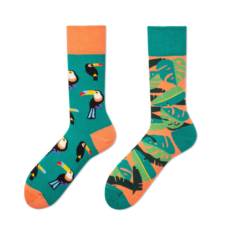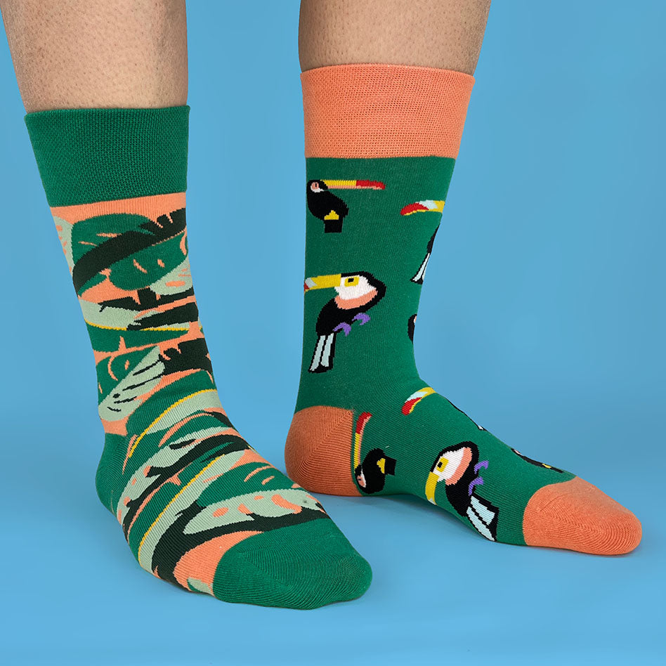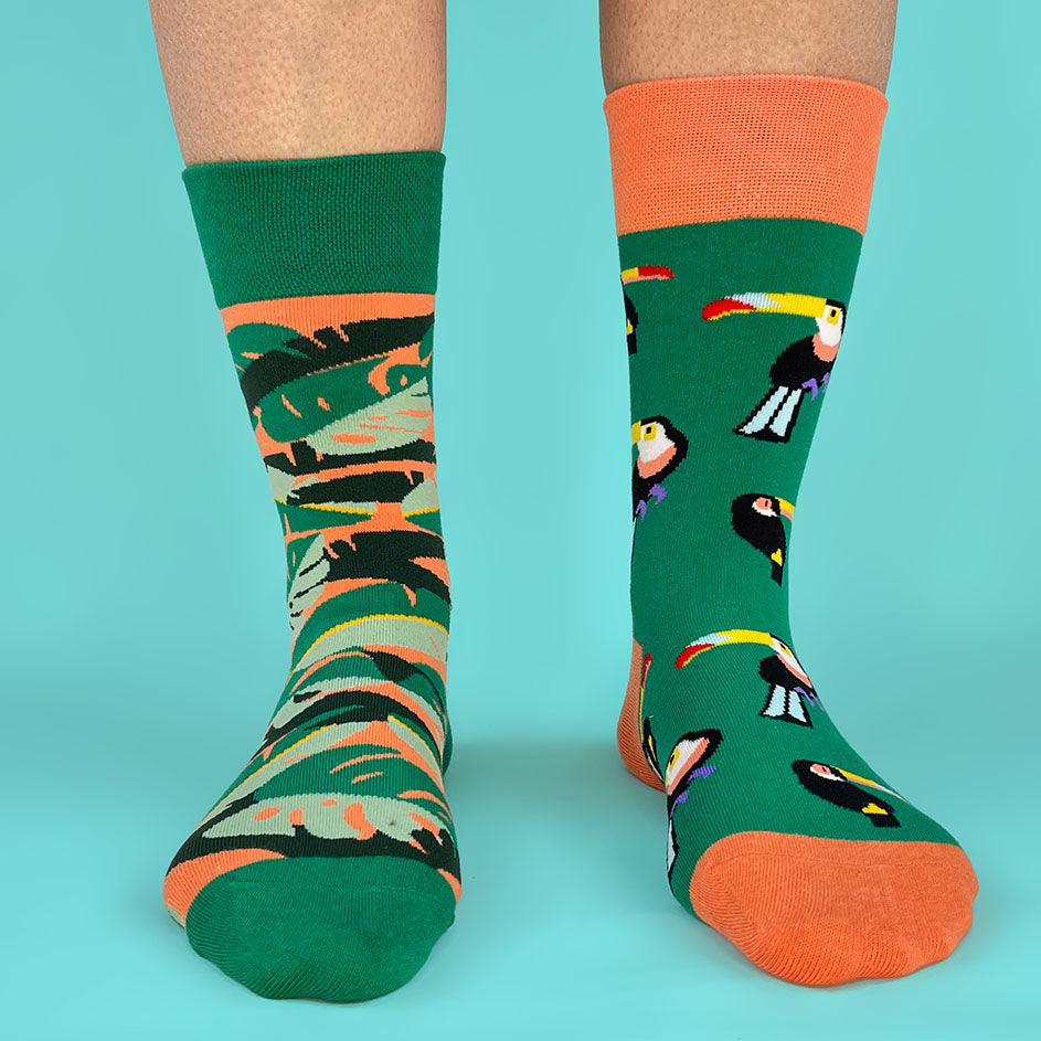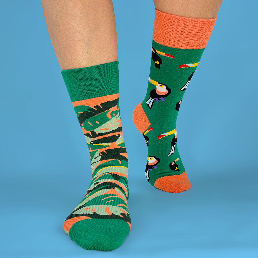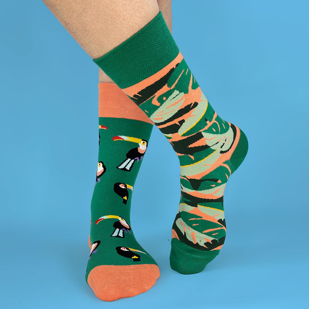 Tus pies se van de viaje directo a la selva tropical 🦜🌿. Un calcetín lleno de tucanes coloridos y otro con hojas exuberantes.